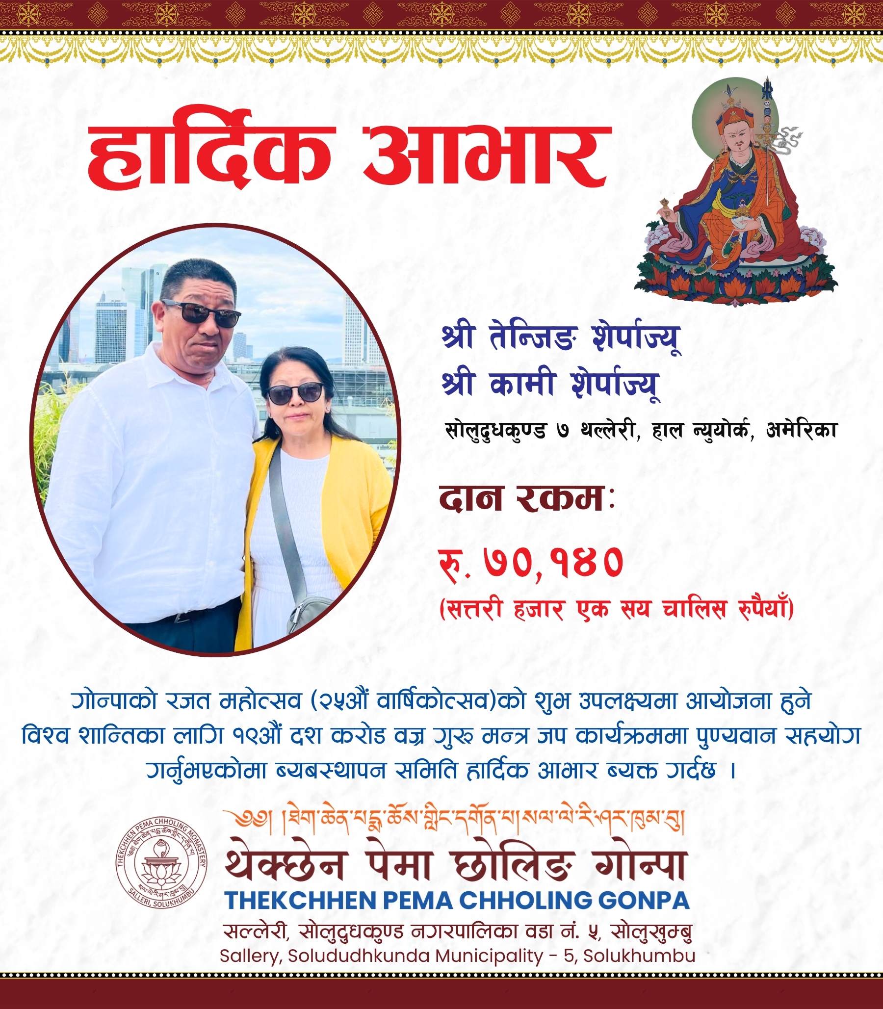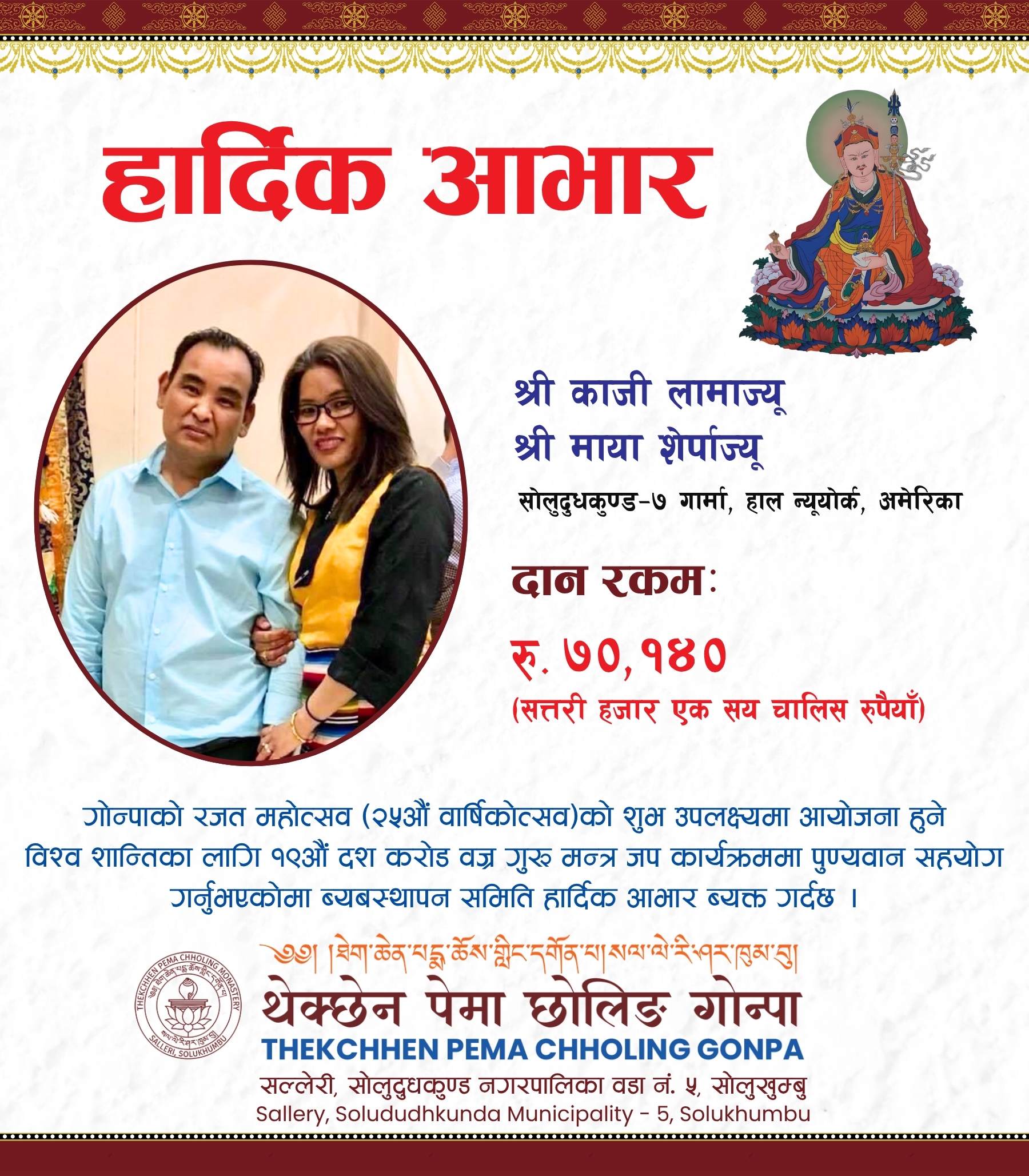 बि.सं. २०५०मा शुरु भई २०५२मा स्थापना पश्चात २०५८मा आधिकारिक रुपमा दर्ता भएको यो गुम्बा २०८३मा आफ्नो आधिकारिक दर्ता भएको २५ बर्ष भएको उपलक्ष्यमा रजत जयन्ती तथा बिभिन्न कार्यक्रम मनाउने तयारी गर्दैछ।